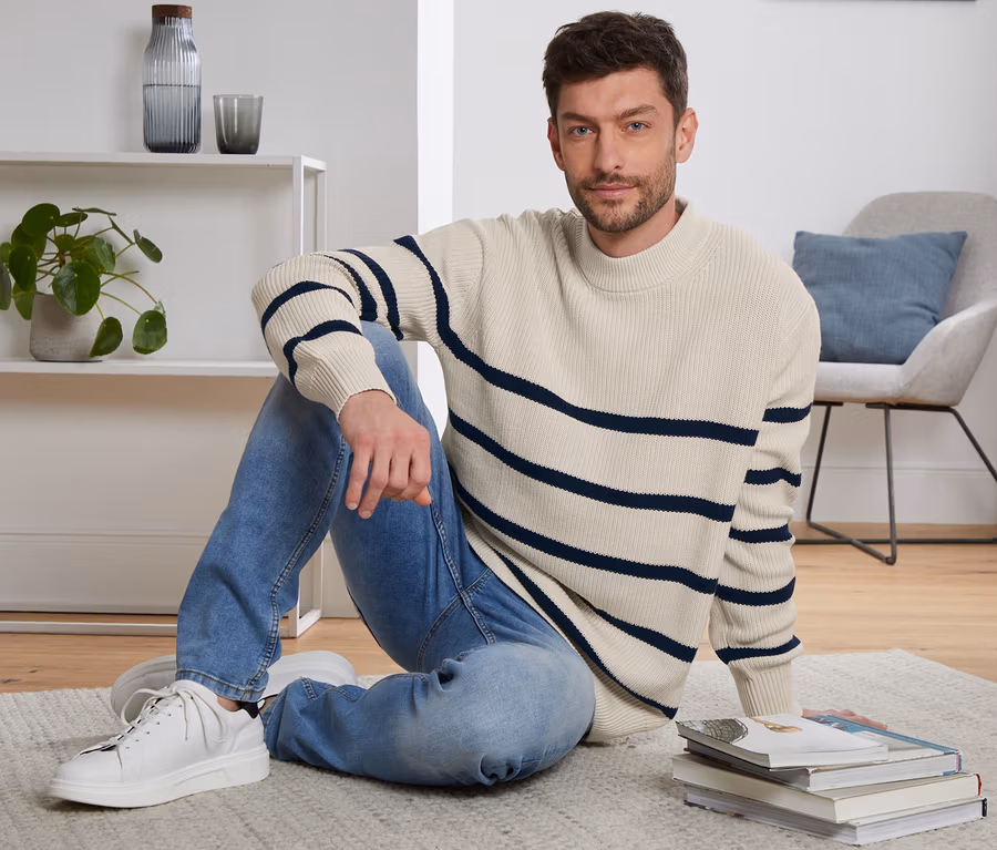 Férfi kötött pulóver, csíkos, krém/sötétkék