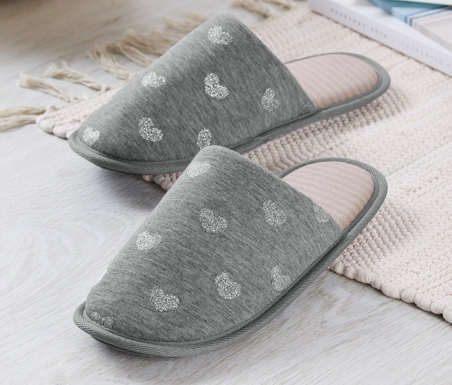Megfelelő ruházattal még jobb és kellemesebb az otthoni pihenés és kikapcsolódás - mindehhez természetesen hozzáillő cipő is kell. Akárcsak ez a házicipő, amely puha, kevert pamutanyagával és puhán párnázott fedőtalpával még mezítláb is csodálatosan viselhető. A csillogó szív mindemellett különleges megjelenést kölcsönöz a lábbelinek.