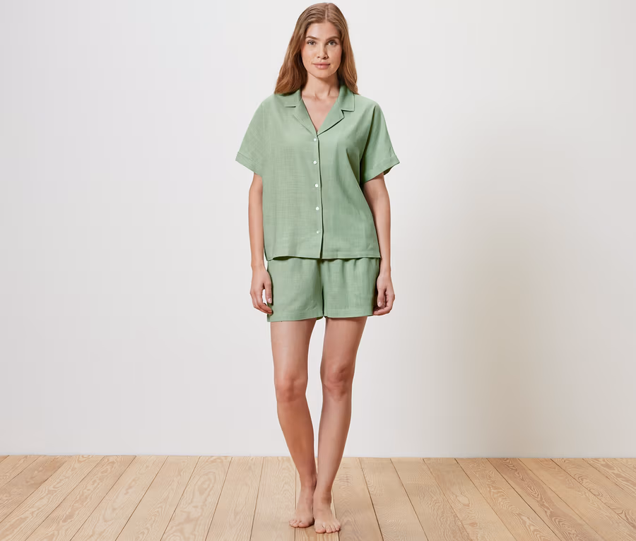 Női rövidnadrágos pizsama, lenvászonnal, zöld