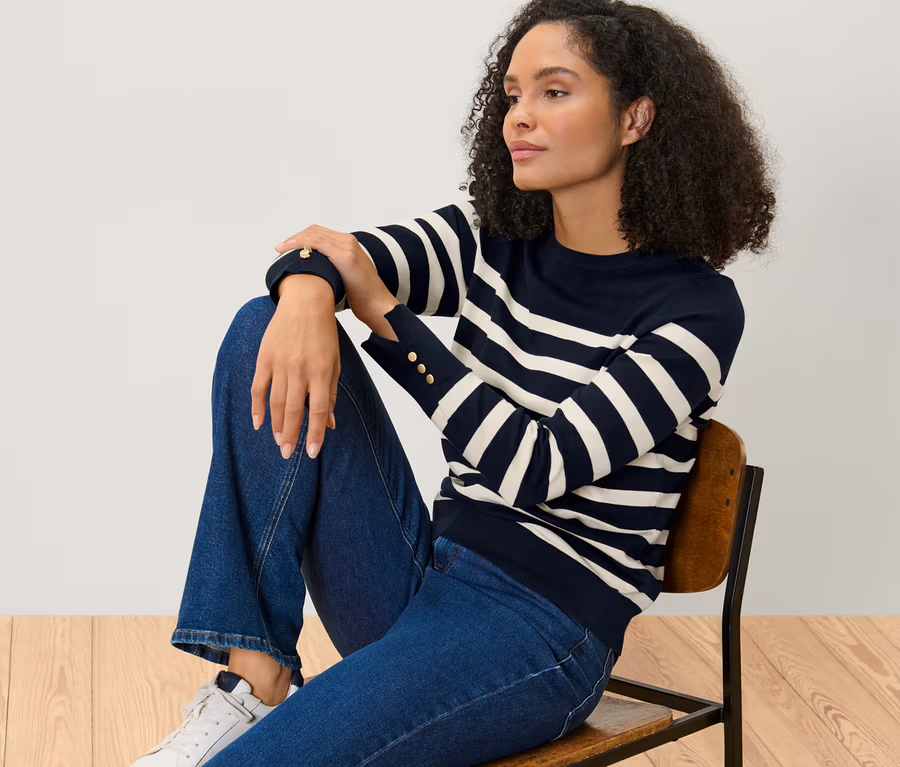 Női finomkötésű pulóver, csíkos, sötétkék/krém