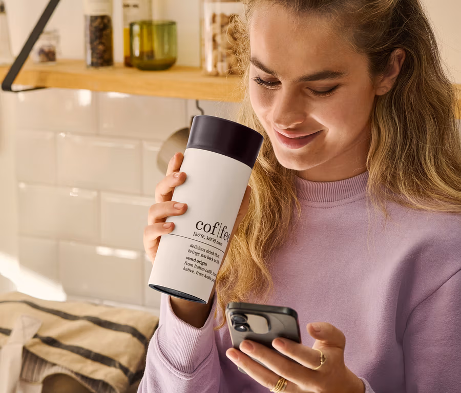 Finom kávé útközben is: Duplafalú szigetelésének köszönhetően ez a bögre hosszabb ideig tartja melegen vagy hidegen az italt, így ideális kedvenc kávéjához. A praktikus, 360°-os ivónyílás és az egy kézzel való kezelhetőség révén tökéletes útitárs.