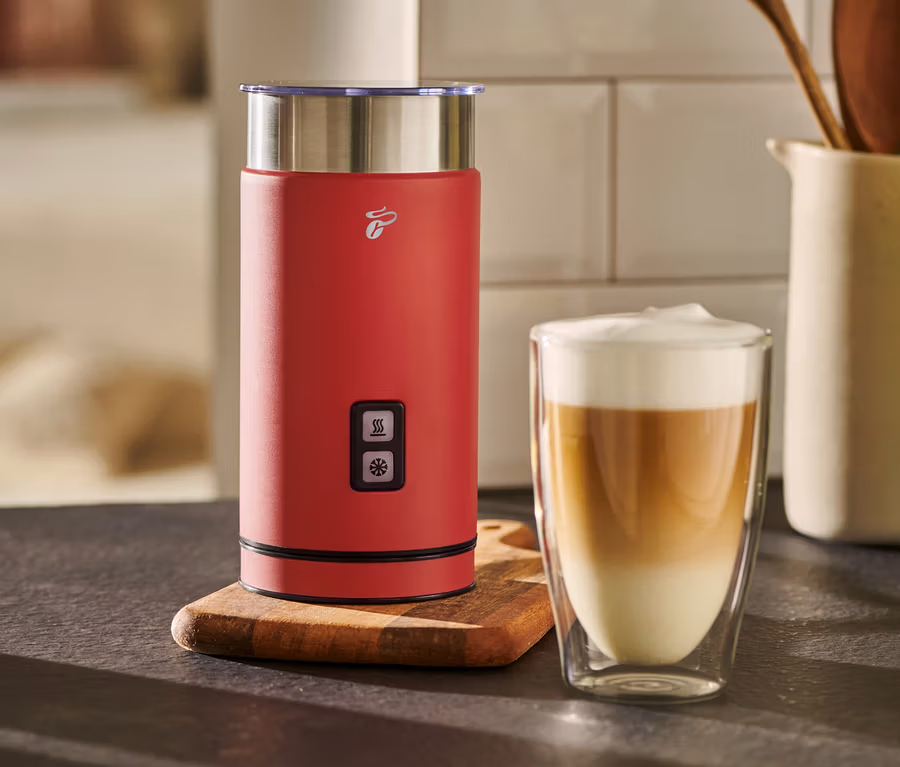 Egyszerű, karcsú elektromos tejhabosító, amellyel néhány másodperc alatt krémes, hideg vagy meleg tejhabot készíthet.